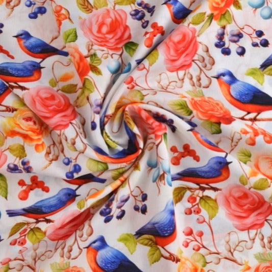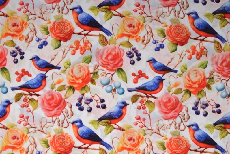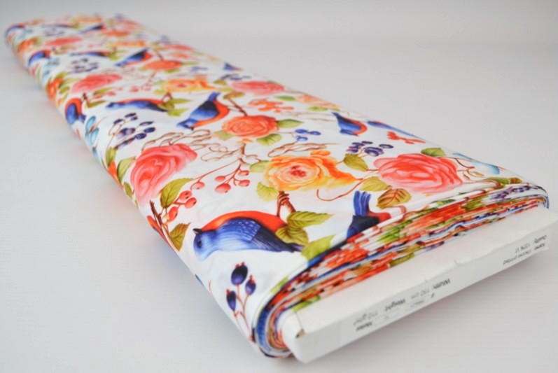 HVIDT VISKOSE STOF MED FUGLE OG ROSER – LET FALD & ELEGANT MAT GLANS