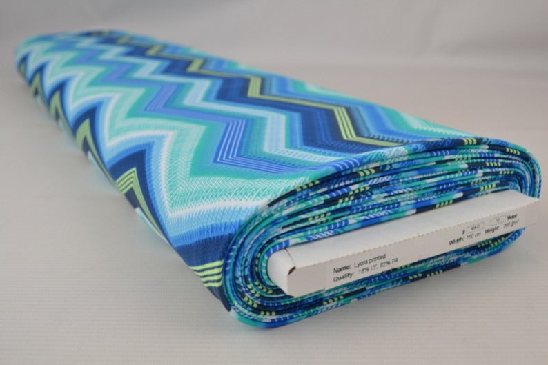 BLÅ LYCRA – CHEVRONSTRIBER, 4-VEJS STRÆK & HURTIGTØRRENDE er restordret og sendes så snart det er tilbage på lager.