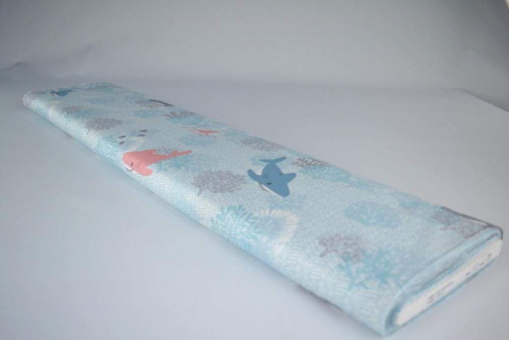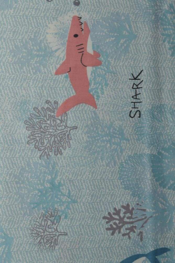 LYSEBLÅ BOMULDSPOPLIN MED HAJER er restordret og sendes så snart det er tilbage på lager.