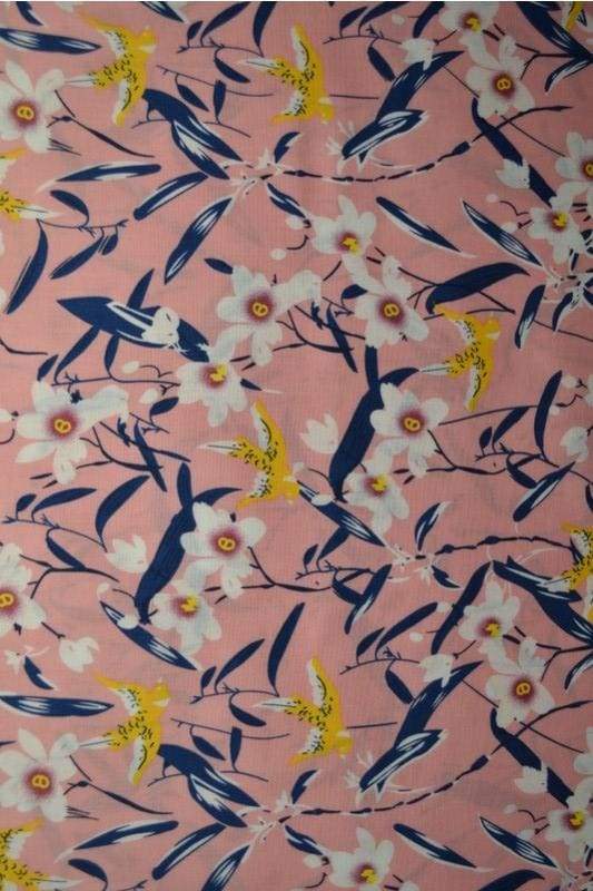 LYSERØD BOMULDSPOPLIN M. GULE FUGLE