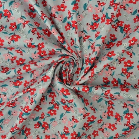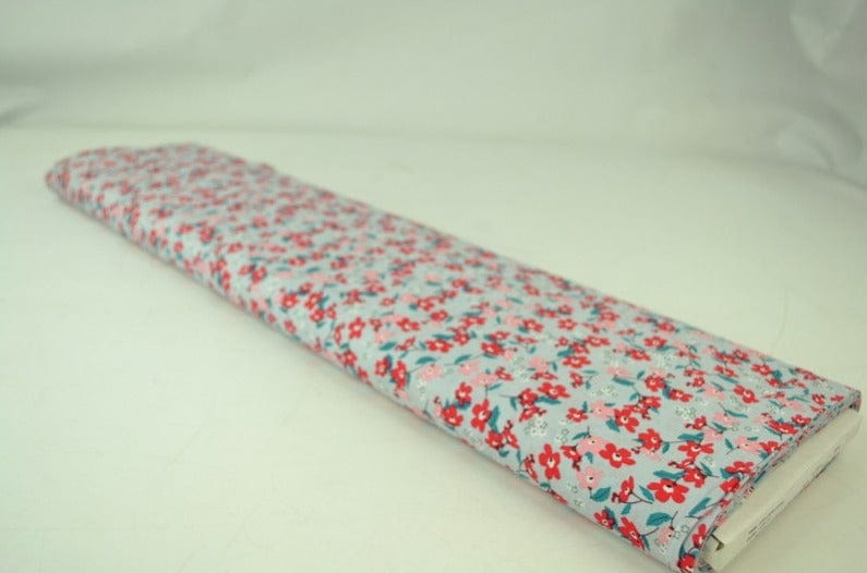 PASTELBLÅ BOMULDSPOPLIN M. RØDE ANEMONER