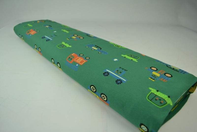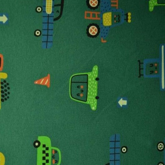 Grønt bomuldsjersey stof med seje biler. Stoffet er strikket i tyndt garn, som er med til at gøre stoffet luftigt og let. Bomulden gør at stoffet er super blødt, og med en lækker kvalitet. Her er der anvendt en blanding af 95 % bomuld og 5 % Elastan. Denne blanding med elastan gør stoffet smidigt og stoffet egner sig derfor godt til t-shirts, undertøj og hvis du skal sy dit eget sengetøj. Designet er virkelig populært, og stoffet er tilmed Oeko-tex certificeret og indeholder derfor ingen skadelige stoffer.