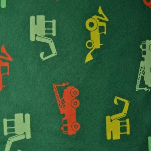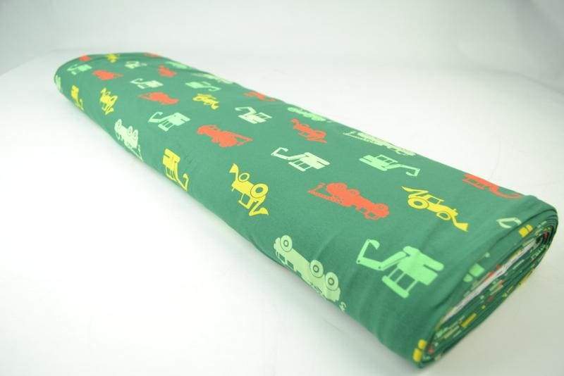 Flot bomuldsjersey stof med flerfarvede gravemaskiner. Stoffet er strikket i tyndt garn, og får dermed en let og luftig karakter. Bomuldsstoffet er samtidig utroligt blødt og lækkert. Stoffet er samtidig tilsat 5 % elastan, som gør stoffet smidigt og strækbart. Det egner sig derfor godt til blandt andet t-shirts og under- og sengetøj. Oeko-tex certificeret gør også at stoffet er fri for allergi- og kræftfremkaldende stoffer.