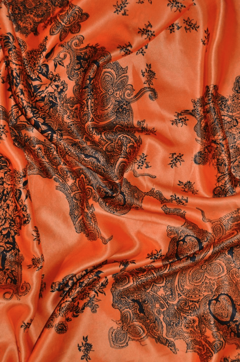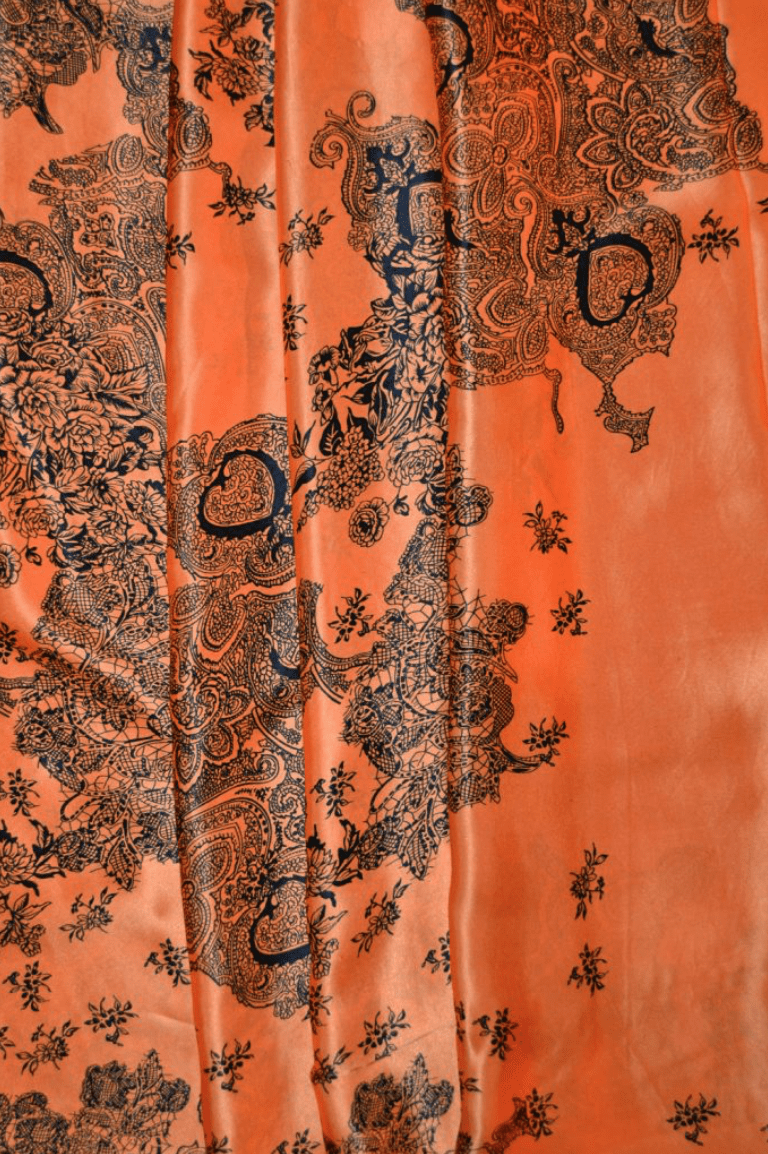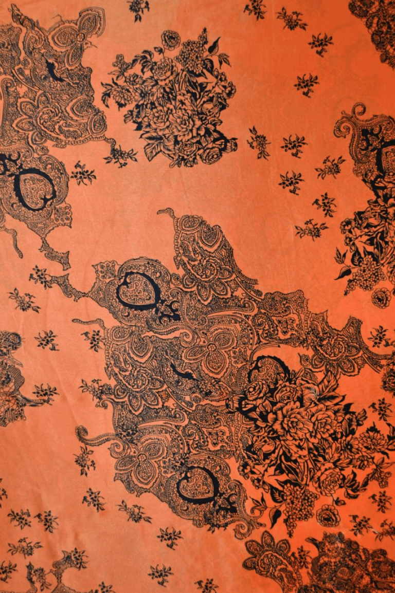 ORANGE SILKE MED MØRKT BLOMSTERMOTIV