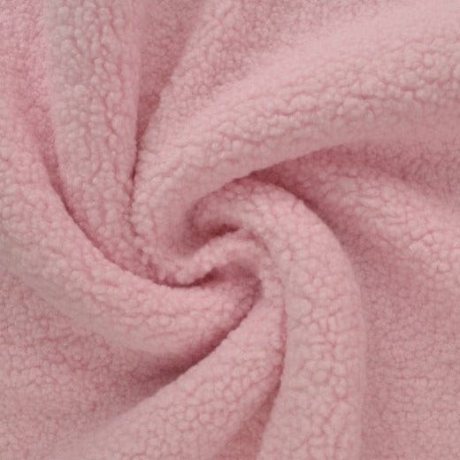Teddy stof er blødt, fluffy og har en overflade der minder om fåreskind.
