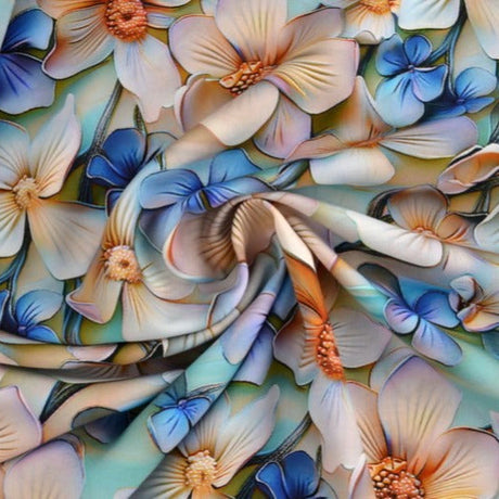 LYSEBLÅT VISKOSE STOF MED HVIDE OG BLÅ BLOMSTER – LET FALD & ELEGANT MAT GLANS