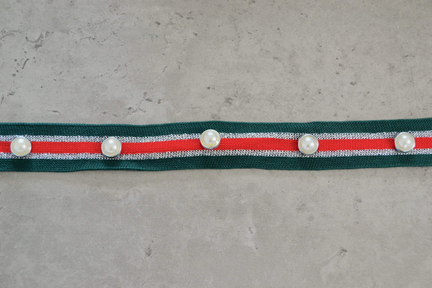 Stribet bånd i grøn, sølv og røde farver. Båndet er dekoreret med perler i midten og har en bredde på 25 mm.