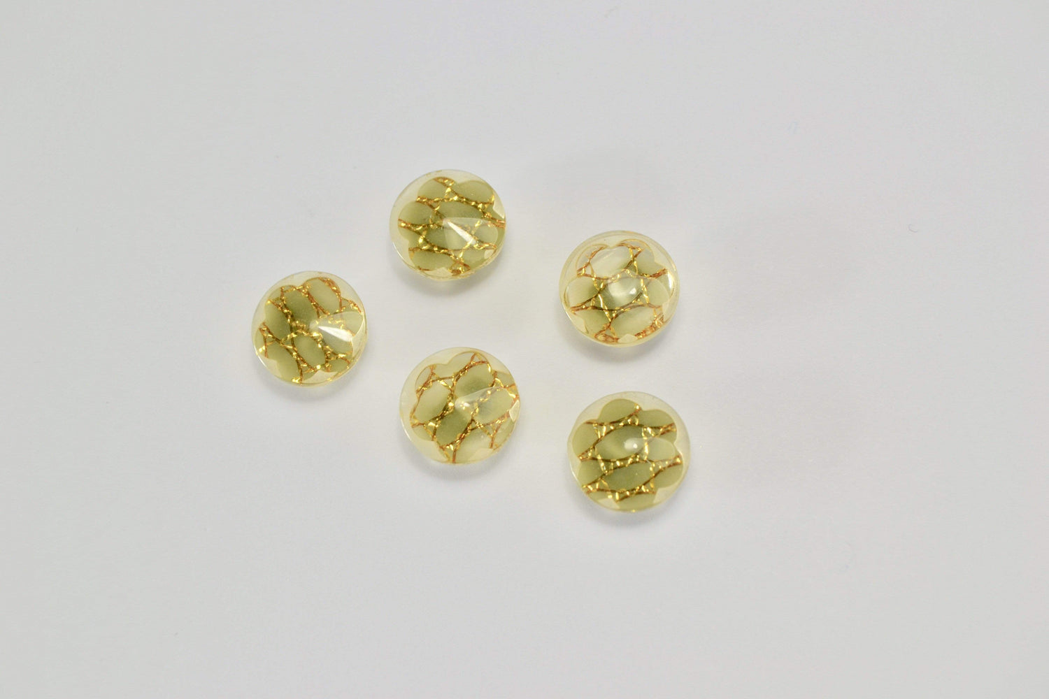 Grønne knapper med blomster mønster og guld detaljer. Knapperne er lavet af plastik og har en diameter på ca. 15 mm.