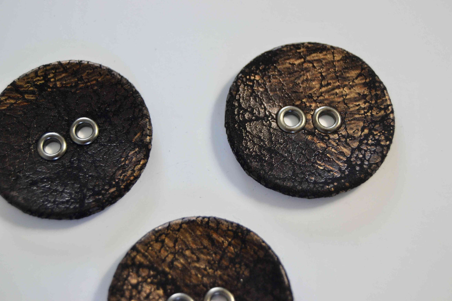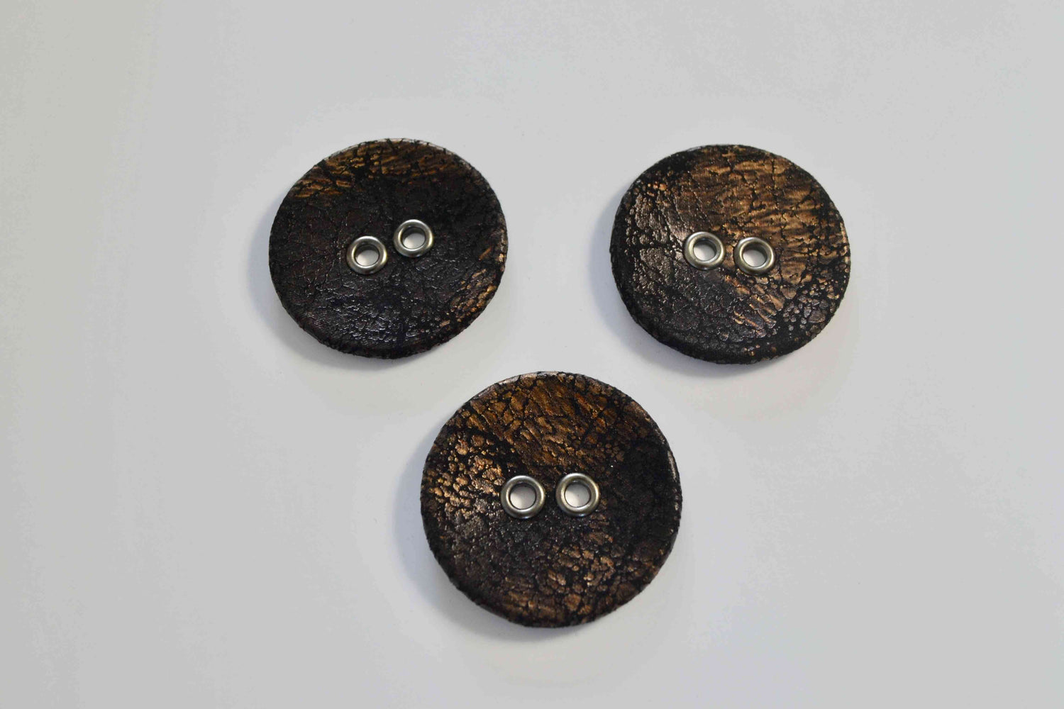 Sort imiteret 2-huls knapper. Knapperne er lavet af plastik / polyester og har en diameter på ca. 40 mm.