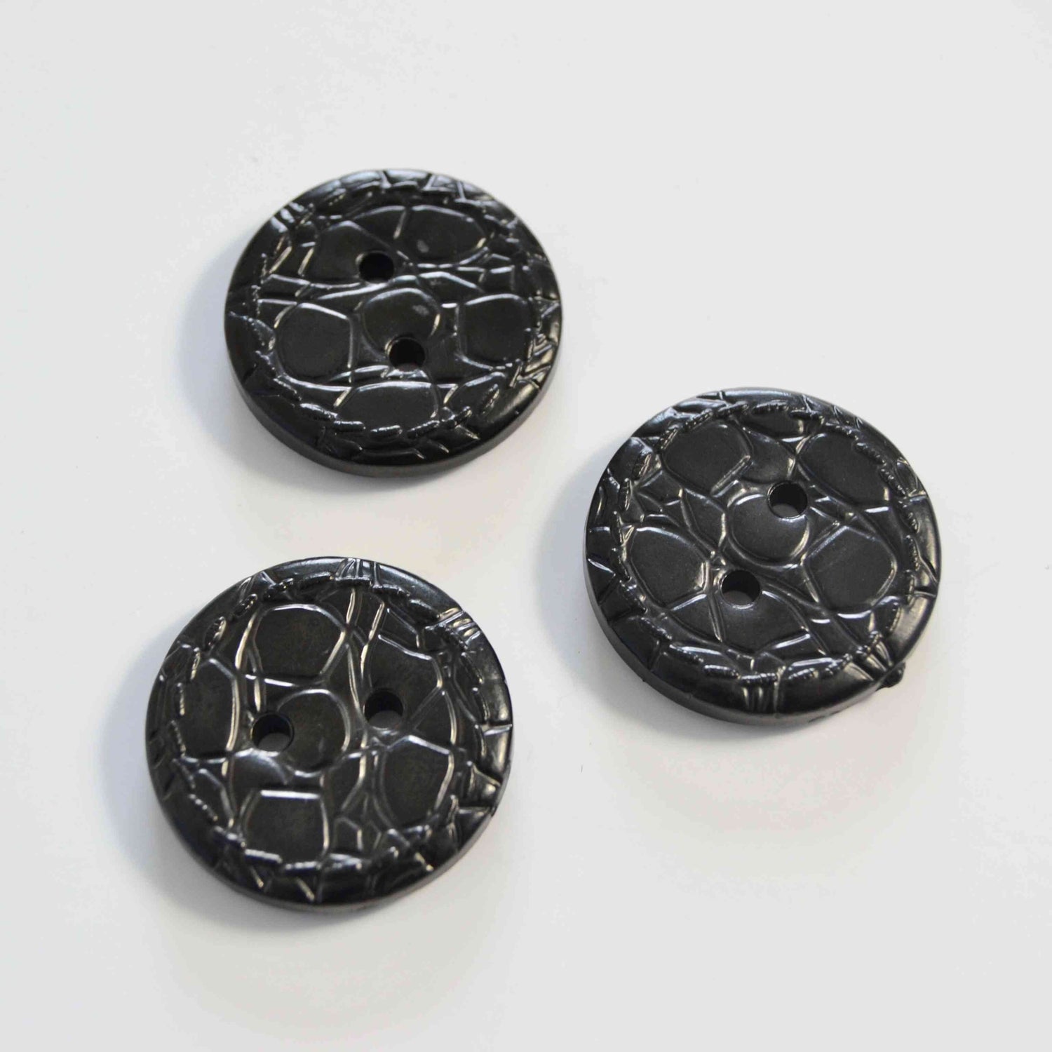 Sort 2-huls knap med krokodille mønster. Knapperne er lavet af plastik og har en diameter på ca. 30 mm.