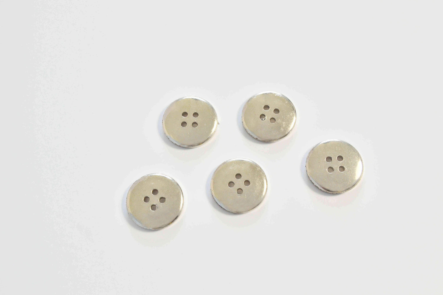 Sølv 4-huls knap. Knapperne er lavet af plastik og har en diameter på ca. 18 mm.