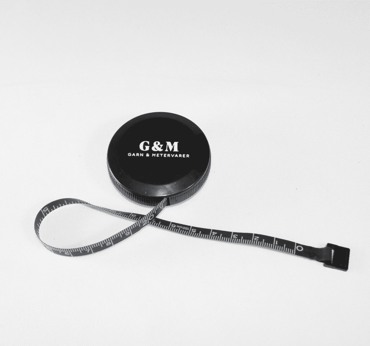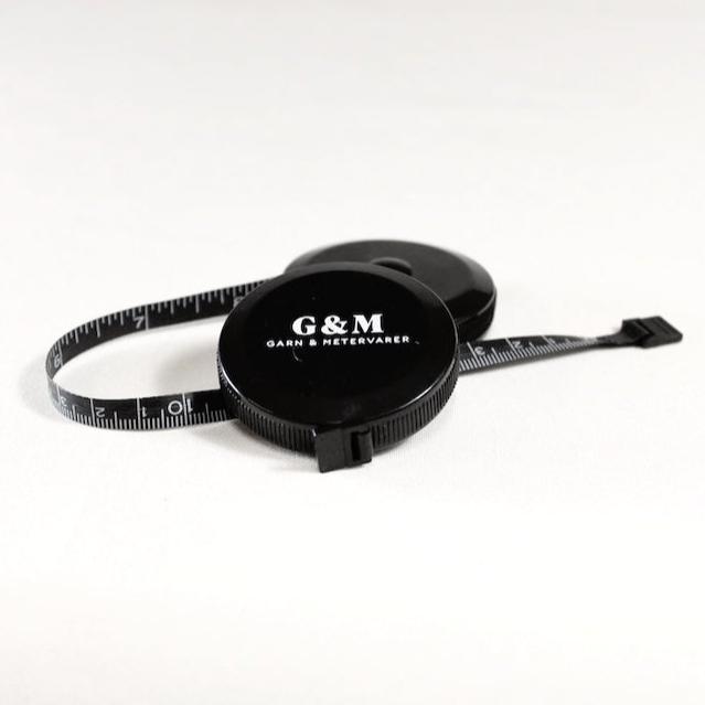 Rullemålebånd i sort med G&M's logo påtrykt. Målebåndet trækkes ud til den ønskede længde - op til 150 cm - og sammenrulles ved at holde knappen på bagsiden inde. Rullemålebåndet er kompakt, let transportabelt, og bliver ikke filtret eller krøllet i tasken eller syskrinet.