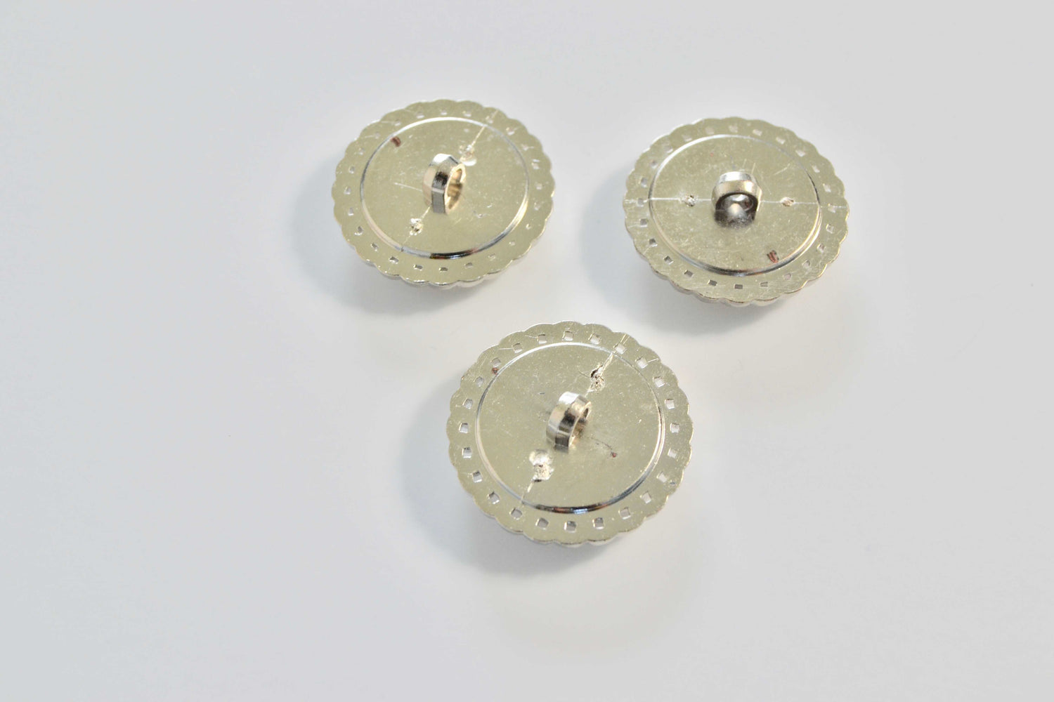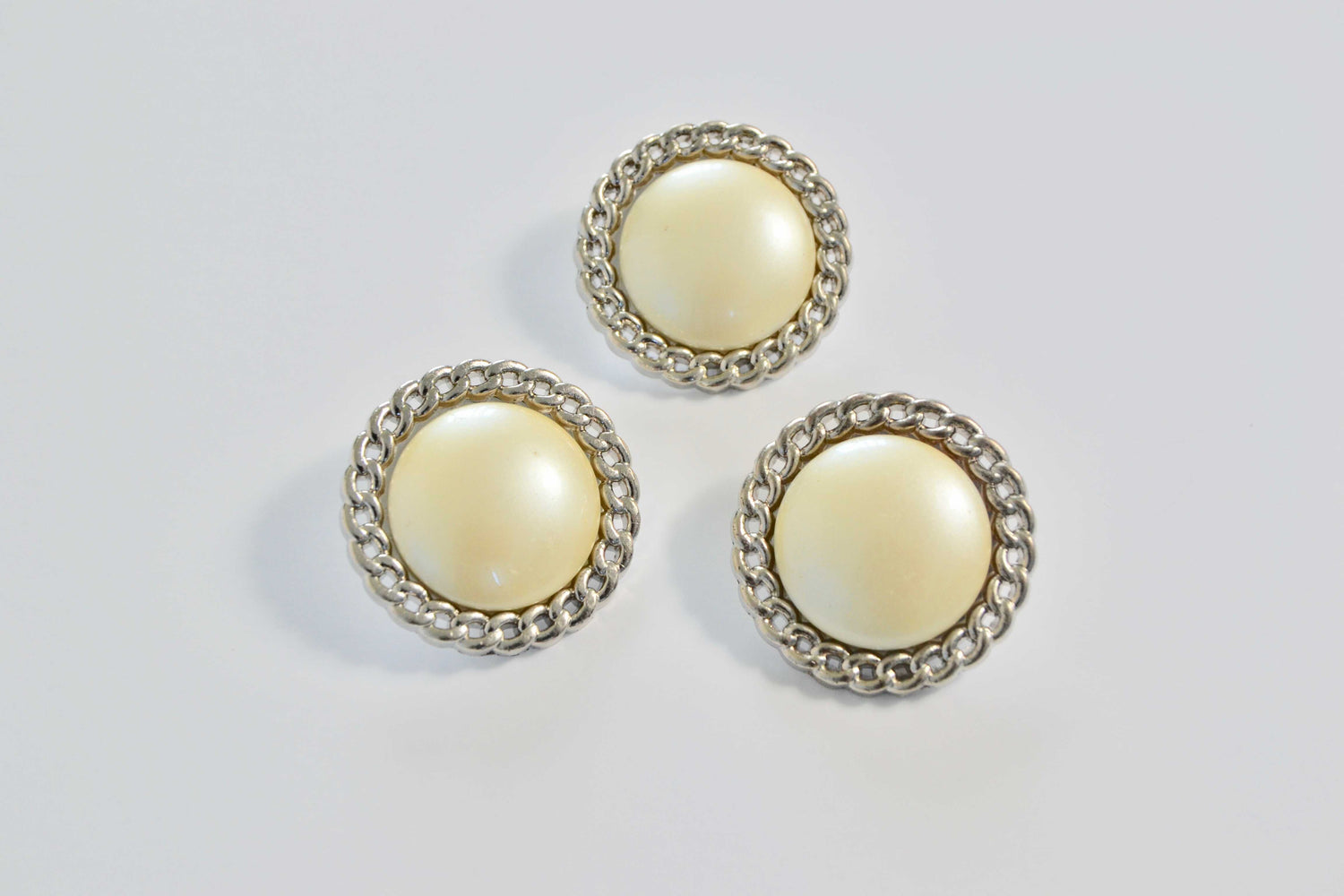 Hvid øjeknap med perler. Knapperne er lavet af plastik og har en diameter på ca. 33 mm.