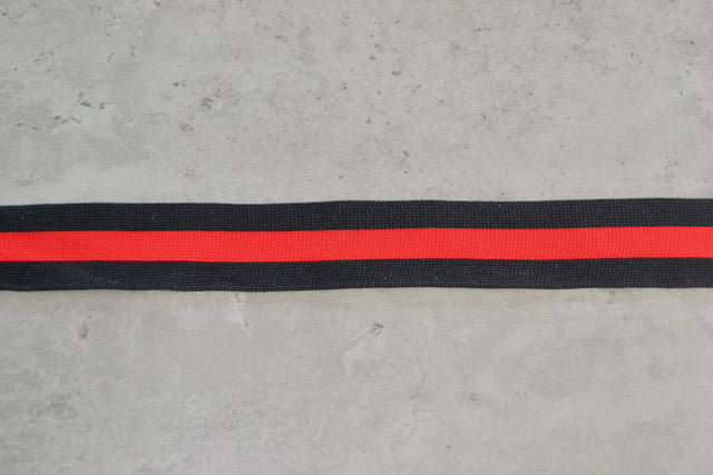 Sort bånd med en rød stribe i midten. Båndet har en bredde på 30 mm.