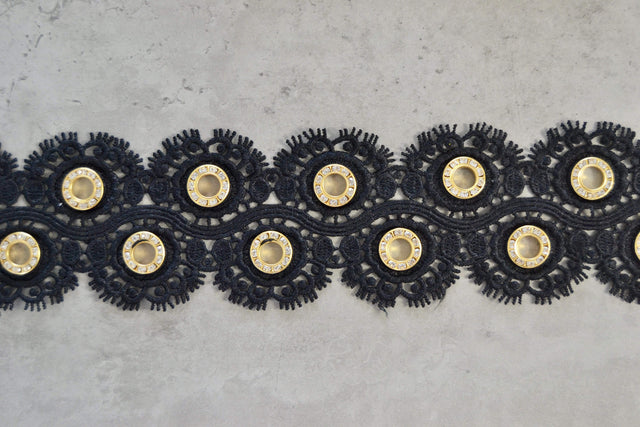 Flot sort blomsterbånd med guld ringe i midten, som er beklædt med små sten. Båndet har en bredde på 55 mm.