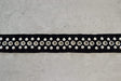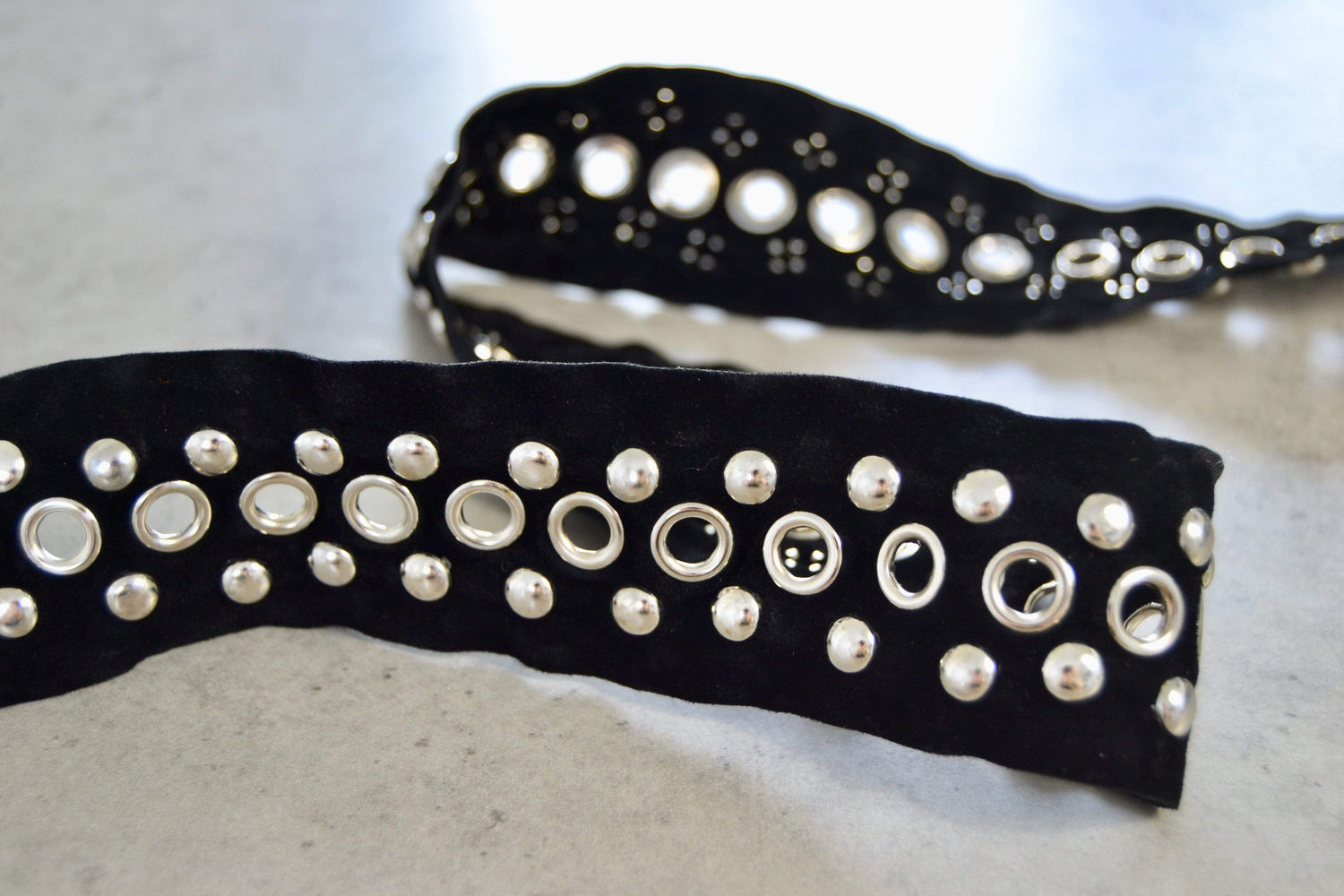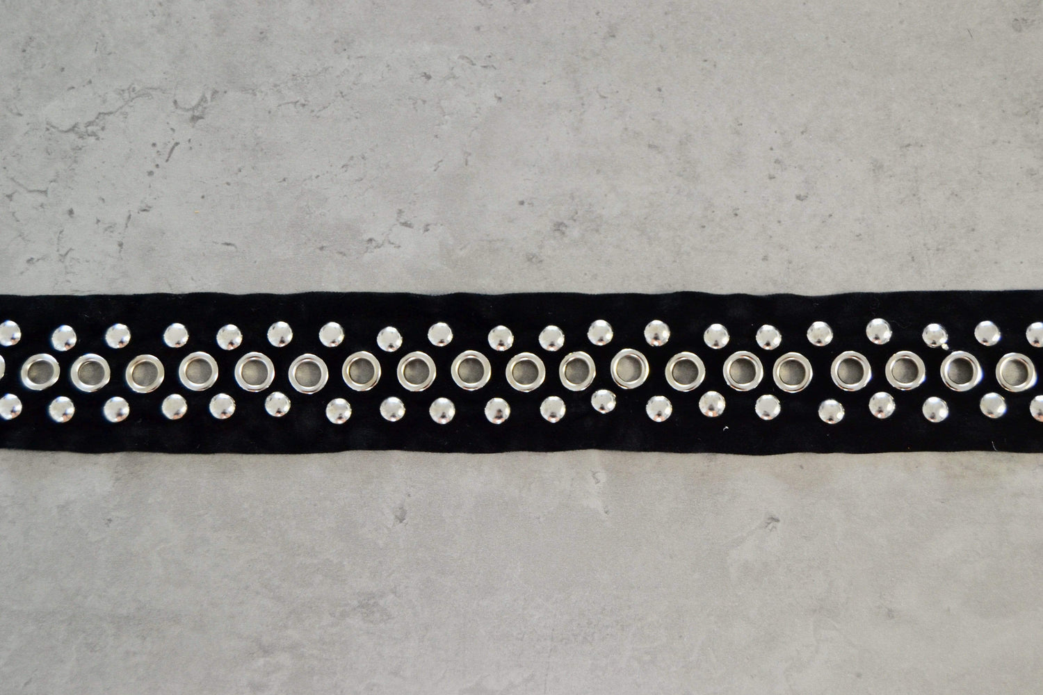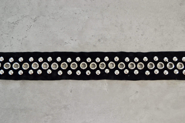 Sort velourbånd med runde nitter og huller i midten af båndet. Båndet har en bredde på 40 mm.